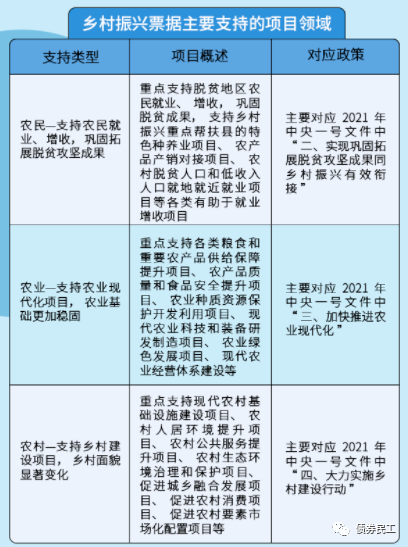 鄉村振興票據重點支持的領域是三農領域,募集資金投向分別對應的是農民就業增收項目、農業現代化建設項目和農村鄉村建設三大領域。鄉村振興票據重點支持的領域,與中央近年來對三農問題關注的領域基本相同,項目內涵也基本一致,通過發行債券的金融手段,助力農村農業發展,實現鄉村振興。
