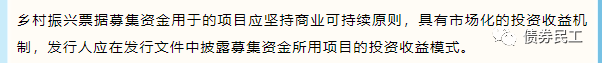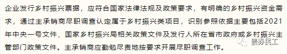 鄉村振興票據的募投項目,應該符合國家、省市鄉村振興主管部門政策文件認定的項目范疇。如果單純從重點支持領域來看,符合要求的募投項目會很多。因此新規中特別明確需要符合政策文件的認定范疇,主承銷商來承擔項目認定責任。在一定程度上是對鄉村振興票據項目范圍的限定,防止新政策被濫用。募投項目的合規性要求,是鄉村振興票據的準入門檻。