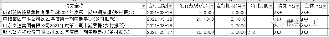 根據wind資訊的統計信息,自2021年3月17日起,累計發行4只鄉村振興票據產品,分別為:新希望六和股份有限公司2021年度第一期中期票據(鄉村振興)、山東高速集團有限公司2021年度第二期中期票據(鄉村振興)、中糧集團有限公司2021年度第一期中期票據(鄉村振興)和成都益民投資集團有限公司2021年度第一期中期票據(鄉村振興)。發行主體主要為AAA和AA+的高評級企業。
