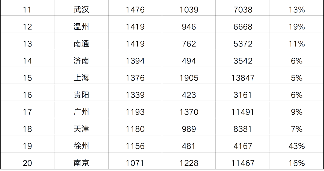 前三季度土地成交建面TOP20中,一線城市中上海、廣州雖榜上有名,不過與去年同期相比,供地力度同比均有所下滑。三四線城市中,本次入榜的五個城市除保定外,其余均來自長三角地區,分別是鹽城、溫州、南通和徐州,并且排名均排在第10名及以后。