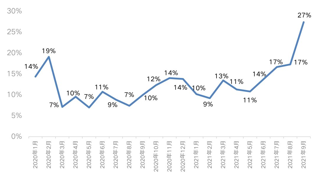 自下半年以來,房地產行業資金環境明顯收緊,同時7月末以來以22個集中供地城市為代表的重點城市紛紛調整了供地規則,尤其加強了對房企購地資金和競拍資格的審查。在此影響下,第三季度房企拿地積極性明顯受挫,福州、成都、天津、濟南、青島等多個集中拍地的城市均有多宗土地遭遇中止出讓,金華、嘉興等熱點城市的集中土拍也遇冷,導致第三季度土地流拍現象顯著增多,9月重點城市的土地流拍率已飆升至27%。