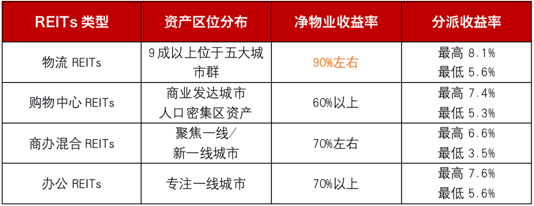 綜上可以發(fā)現(xiàn),物流REITs的資產(chǎn)要求最高但其分派收益率也是最高的,達(dá)5.6%-8.1%,購物中心REITs次之,為5.3%-7.4%,最低的是商辦混合REITs,約3.5%-6.6%。