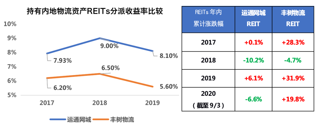 今年隨著疫情后中央對武漢地區(qū)經(jīng)濟(jì)的大力扶持和投入,預(yù)計(jì)武漢項(xiàng)目出租率仍可保持在較高水平,運(yùn)通網(wǎng)城最近三年其凈物業(yè)收益率一直保持在9成左右,豐樹物流近3年整體運(yùn)營效率持續(xù)改善,2020年Q1凈物業(yè)收益率已接近9成,豐樹持有的內(nèi)地物流項(xiàng)目表現(xiàn)略遜一籌,但凈物業(yè)收益率也維持在8成以上。