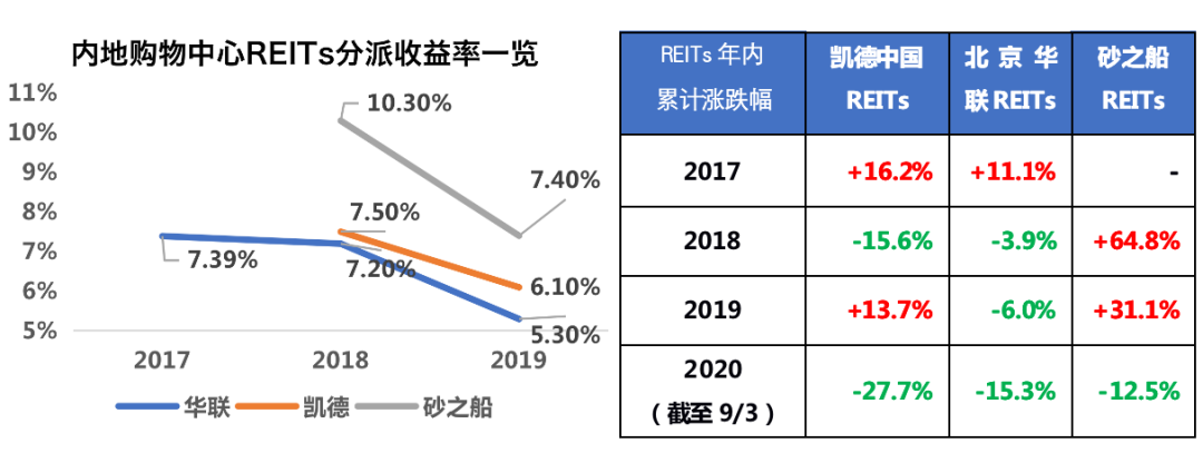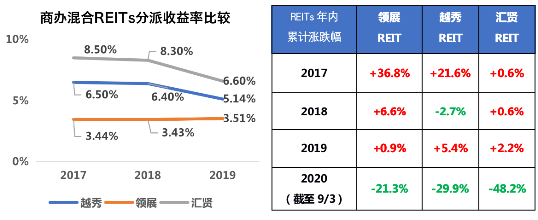 另一方面,近3年底層資產(chǎn)運(yùn)營效率一直有所下滑的匯賢REIT的分派收益率也在不斷下滑,2019年較2018年下降1.7個(gè)百分點(diǎn),下降幅度較大,這主要是由于2019年?duì)I商環(huán)境較為困難,持有物業(yè)收入減少,同時(shí)為了維持物業(yè)平穩(wěn)運(yùn)營,保持充足的營運(yùn)現(xiàn)金流,將分派比例由100%將至90%,造成2019年整體收益率下降。