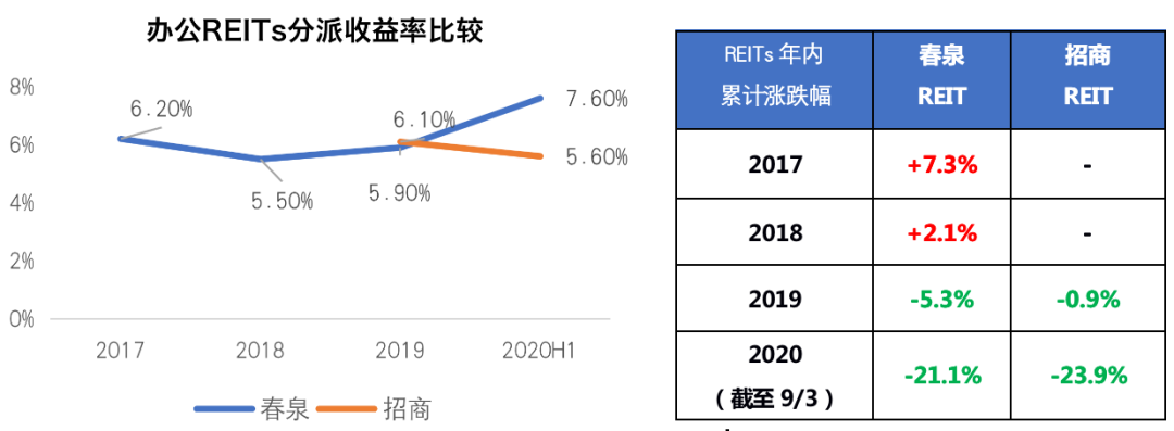 擁有辦公資產(chǎn)的兩只REITs分別為春泉產(chǎn)業(yè)信托(下稱春泉REIT)及招商房地產(chǎn)信托(下稱招商REIT)。春泉REIT在內(nèi)地僅一處資產(chǎn),位于北京市朝陽區(qū)建國路,是北京核心CBD區(qū)域,交通便利,位置優(yōu)越,連年保持高于市場平均水平的出租率。招商REIT在擁有四處辦公資產(chǎn)及一個(gè)商業(yè)資產(chǎn),均位于深圳前海蛇口自由貿(mào)易區(qū)的核心區(qū)域。
