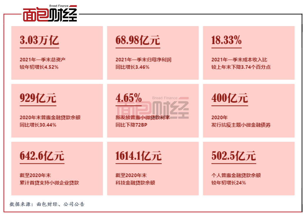 截至2020年末,該行人行口徑普惠金融貸款余額達(dá)到929億元,同比增加217億元,增幅達(dá)30.44%,增量增速均創(chuàng)近三年新高。新發(fā)放普惠小微貸款利率為4.65%,同比下降72BP。