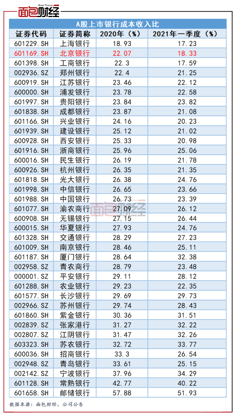 業(yè)績增長的同時,北京銀行加強(qiáng)了成本管理,優(yōu)化了費(fèi)用結(jié)構(gòu),該行成本收入比持續(xù)下降。2020年,該行的成本收入比為22.07%,較上年同期下降1.16個百分點(diǎn)。2021年一季度,該行的成本收入再次下降3.74個百分點(diǎn)至18.33%。與其他上市銀行相比,北京銀行的成本收入比較低,經(jīng)營效率較高。