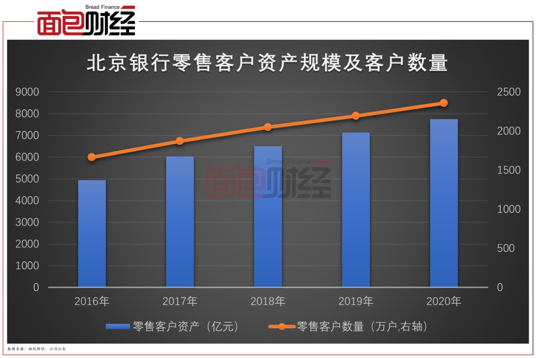 截至2020年末,北京銀行管理的零售客戶資產(chǎn)達(dá)到7748億元,較年初增長612億元。零售存貸款規(guī)模分別為3925億元和5050億元,較上年同期分別增加404億元和623億元,增幅分別為11.5%和14.1%。零售客戶達(dá)2357.9萬戶,較年初增長163.7萬戶,增幅為7.4%
