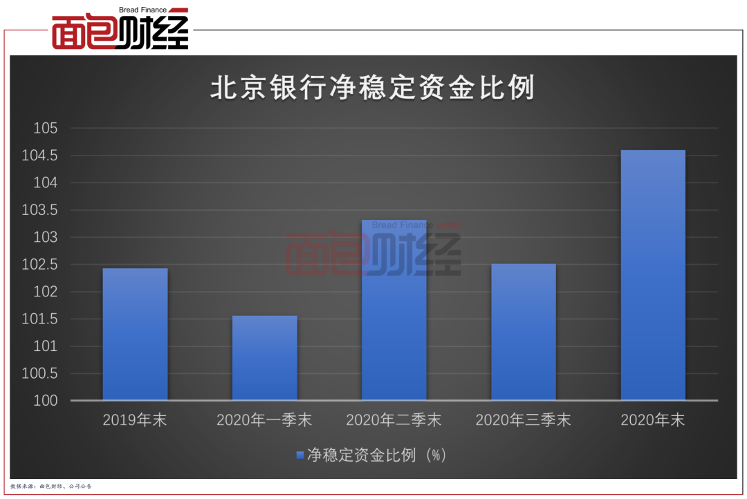 除了資本方面,流動性風(fēng)險管理對于銀行來說也越來越重要。截至2020年末,北京銀行的凈穩(wěn)定資金比例為104.60%,較上年末增加2.17個百分點(diǎn)。