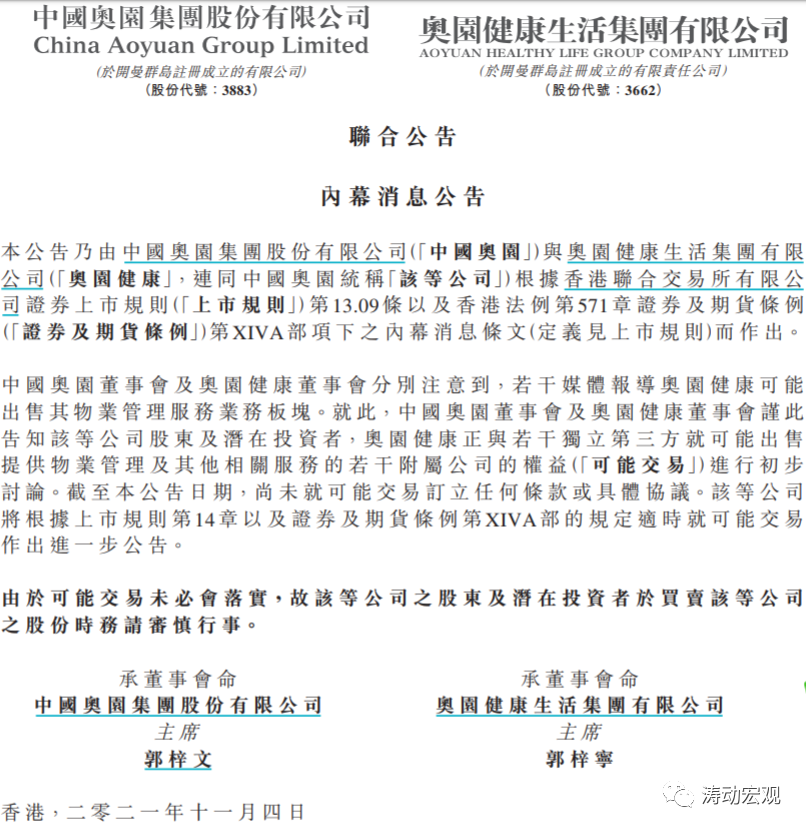 1、2021年11月3日,有媒體報(bào)道稱,為緩解流動(dòng)性壓力,中國(guó)奧園擬出售旗下物業(yè)公司奧園健康控股股權(quán),已接觸合生創(chuàng)展等多個(gè)買(mǎi)家,并希望11月底前能夠完成。2021年11月4日,中國(guó)奧園、奧園健康聯(lián)合發(fā)布公告稱“奧園健康正與若干獨(dú)立第三方就可能出售提供物業(yè)管理及其他相關(guān)服務(wù)的若干附屬公司的權(quán)益進(jìn)行初步討論,截至目前尚未就可能交易訂立任何條款或具體協(xié)議”。