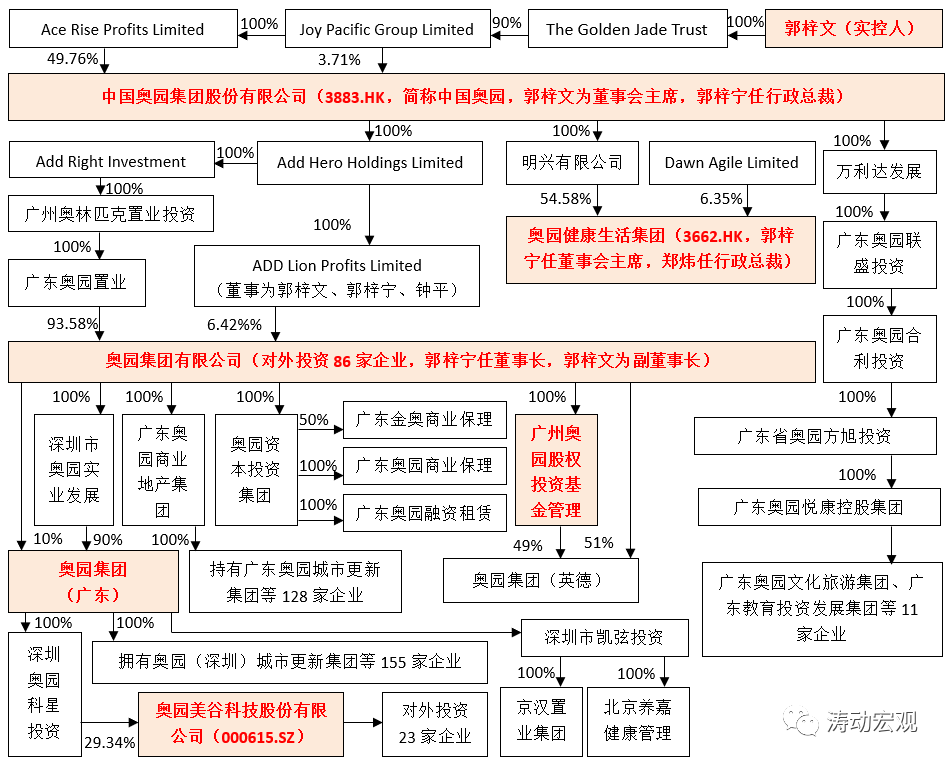 奧園系以郭氏家族為核心,兩大發(fā)債企業(yè)、三家上市公司為主體,同時(shí)還擁有商業(yè)保理、融資租賃以及私募基金等類金融機(jī)構(gòu)。
