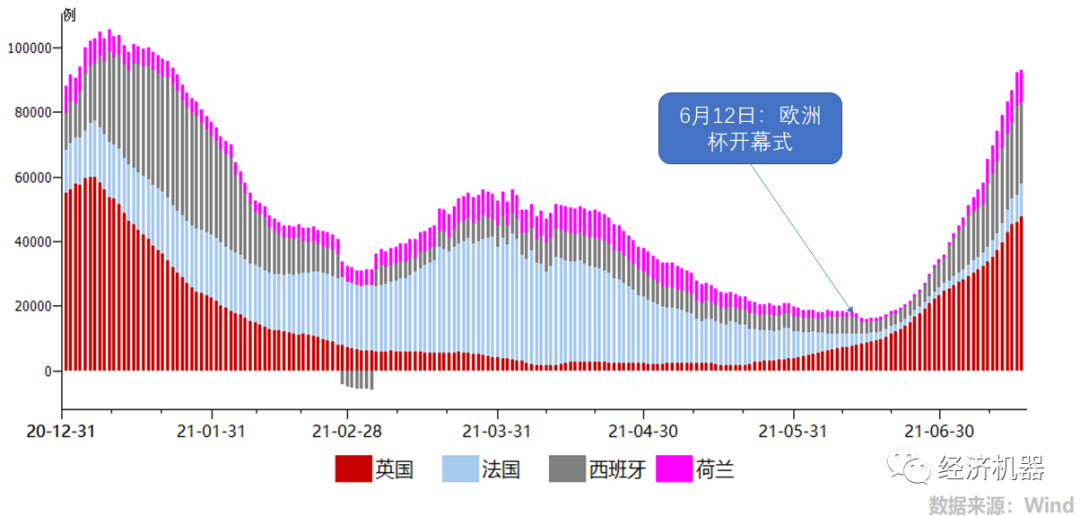 過(guò)去半年,海外疫情出現(xiàn)反復(fù),印度等局部“淪陷”此起彼伏。但市場(chǎng)情緒整體平穩(wěn),一個(gè)隱含的假設(shè)是,隨著疫苗接種持續(xù)推進(jìn),疫情最終會(huì)得到控制。但近期,受Delta病毒及美/歐洲杯的影響,一些疫苗接種率高的發(fā)達(dá)國(guó)家,新增感染人數(shù)再次猛烈反彈。下圖1顯示,歐洲杯開(kāi)幕后,幾個(gè)足球強(qiáng)國(guó)感染人數(shù)飆升,而這幾個(gè)國(guó)家的接種率大都超過(guò)了100%,接近群體免疫標(biāo)準(zhǔn)(120%)。