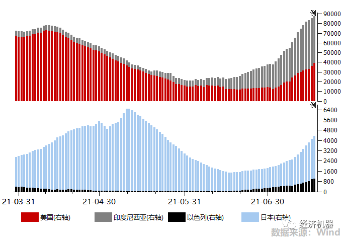 近期,美國(guó),以色列等傳統(tǒng)上認(rèn)為疫苗接種效果最好的國(guó)家,疫情也出現(xiàn)再次反彈。人口大國(guó)印度尼西亞近期感染人數(shù)出現(xiàn)飆升。日本疫情也出現(xiàn)抬升跡象。東京奧運(yùn)會(huì)本周開(kāi)幕,糟糕的防控水平下,很有可能成為另一個(gè)“病毒狂歡節(jié)”。此外,種種跡象表明,海外疫情再次惡化的概率在提升。“疫苗信仰”是當(dāng)前支撐經(jīng)濟(jì)和市場(chǎng)預(yù)期的一個(gè)核心邏輯,這一信仰一旦被打破,或?qū)?duì)風(fēng)險(xiǎn)資產(chǎn)價(jià)格造成一波沖擊。