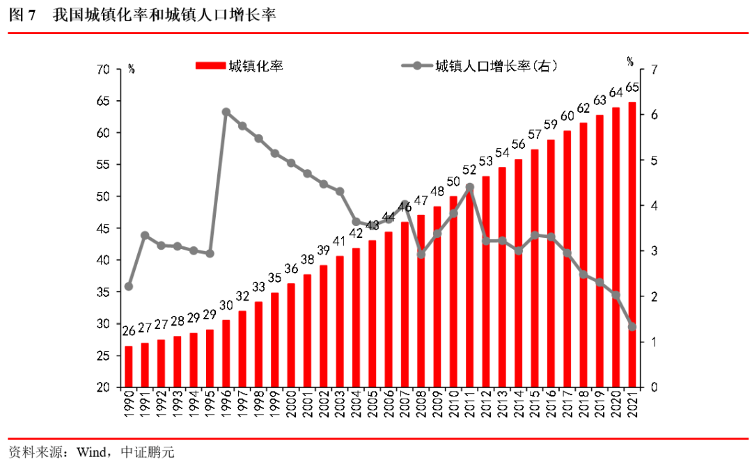 2021年,我國城鎮化率接近65%,雖然從1990年26%的城鎮化率發展到現在,可以說是成績斐然,但低于發達國家平均80%以上的城鎮化率,仍有較大上升空間。城鎮新增人口增長率有下降趨勢,2021年增長率為1.3%,首次跌出2%的水平。在高質量發展階段,如何進一步提升城鎮化率需要新發展模式。