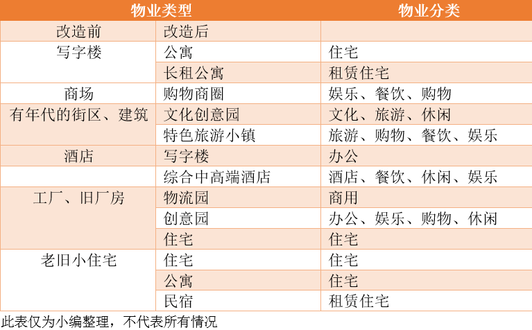下表列舉了幾種常見的物業(yè)轉(zhuǎn)化形式