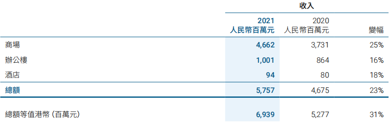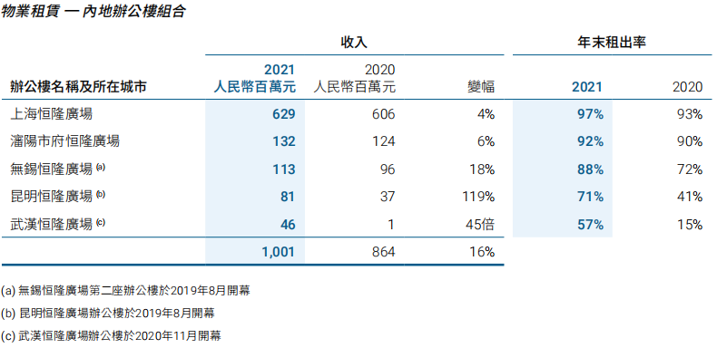 辦公樓組合方面,占內地物業租賃收入總額的17%。2019和2020年開業的三座新辦公樓租出率持續上升,令辦公樓的總收入錄得16%的升幅。