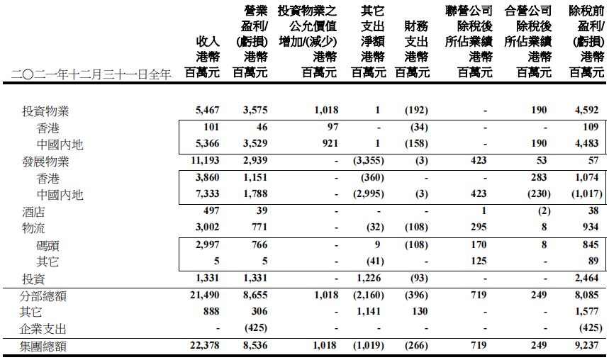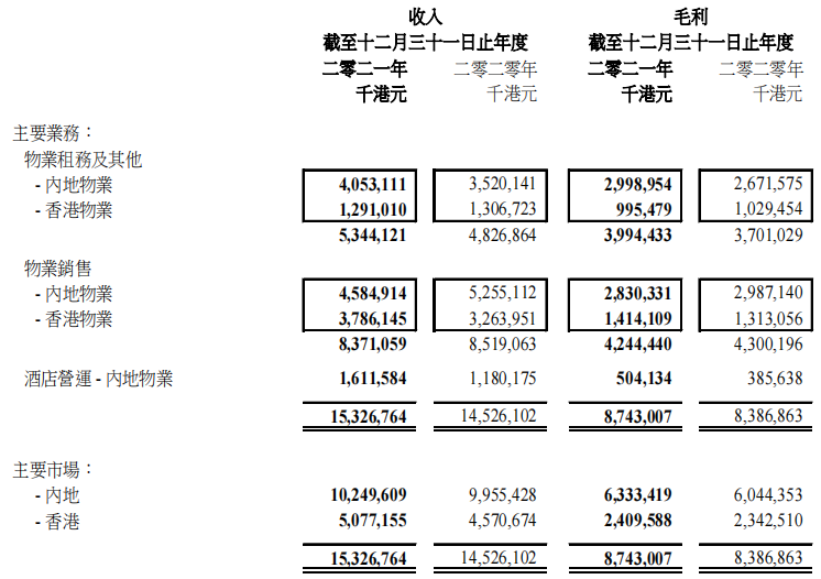 集團內地已落成綜合用途投資物業資產組合包括辦公室、零售、出租公寓和酒店,產生收入同比增長21%至56.6 億港元,毛利同比增長14%至35億港元。