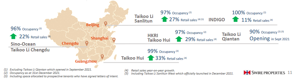 零售物業方面,來自中國內地零售物業的應占租金收入總額增長29%至港幣43.99億元。撇除租金支援攤銷和人民幣升值的影響,集團應占租金收入總額上升17%。2021年12月31日,集團中國內地已落成零售物業的估值為港幣693.74億元。