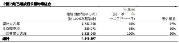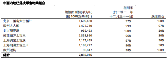 截至至2021年12月底,在內地之自占已建成收租物業組合增加至約810萬平方呎。