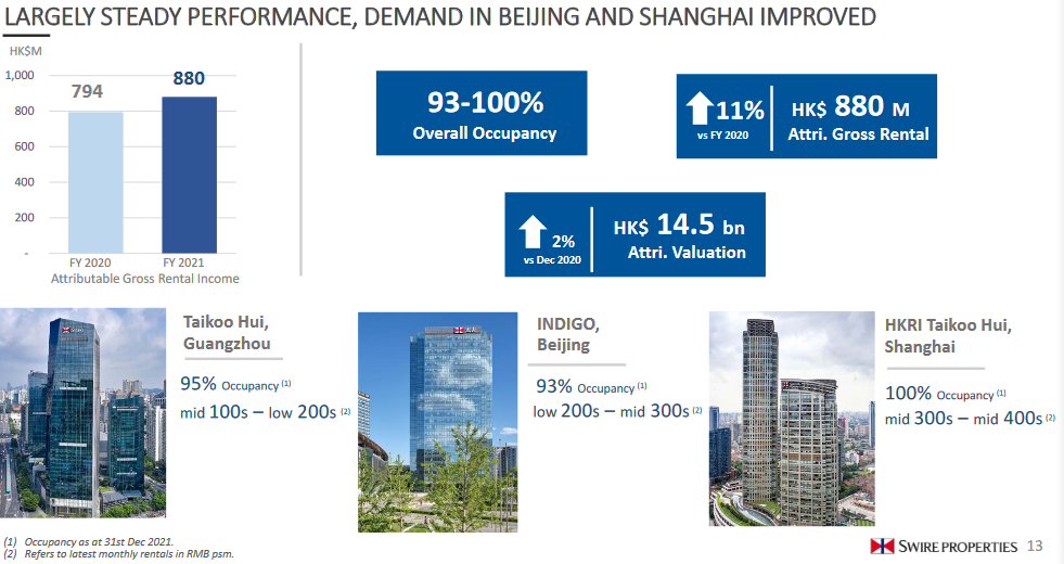 租金及相關收入同比增幅13%。截至2021年底的出租率為95%。