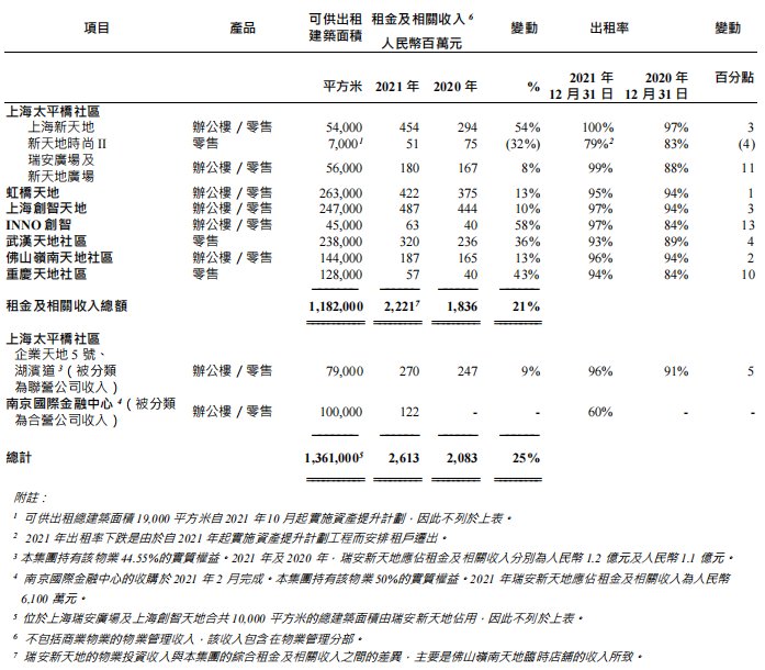 零售及辦公投資物業分別占物業投資租金收入的61%及39%(包括企業天地5號和湖濱道,以及南京國際金融中心)。截至2021年12月31日,出租率平均達93%。