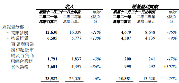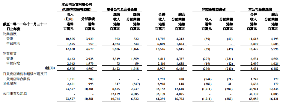 銷售物業收入為126.30億港元,租金收入為65.05億港元,百貨商店業務和超級市場及百貨商店綜合業務收入為17.91億港元,其他業務收入為26.01億港元。