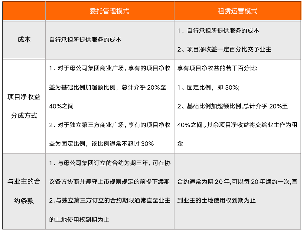 在委托管理模式之下,萬達商管收入主要包括運營管理服務費、開業前咨詢服務費、物業管理服務費等。而在租賃運營模式之下,除了上述費用之外還有來自于商戶租金的收入。