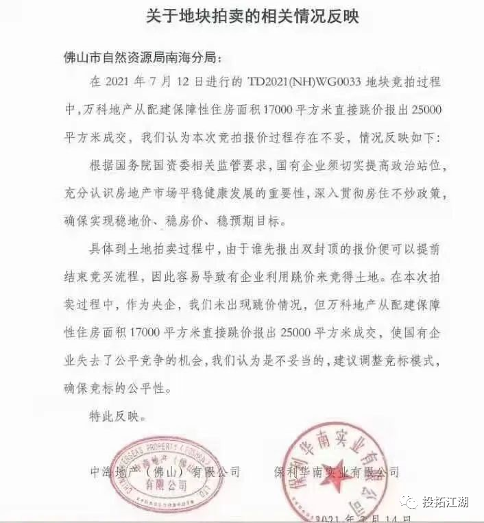 在昨天下午的時候,地產投資圈里面,有一個新聞事件刷屏了。更準確說,是一個蓋有保利和中海,兩家國企鮮章的情況反映函件,在各大微信群刷屏了。