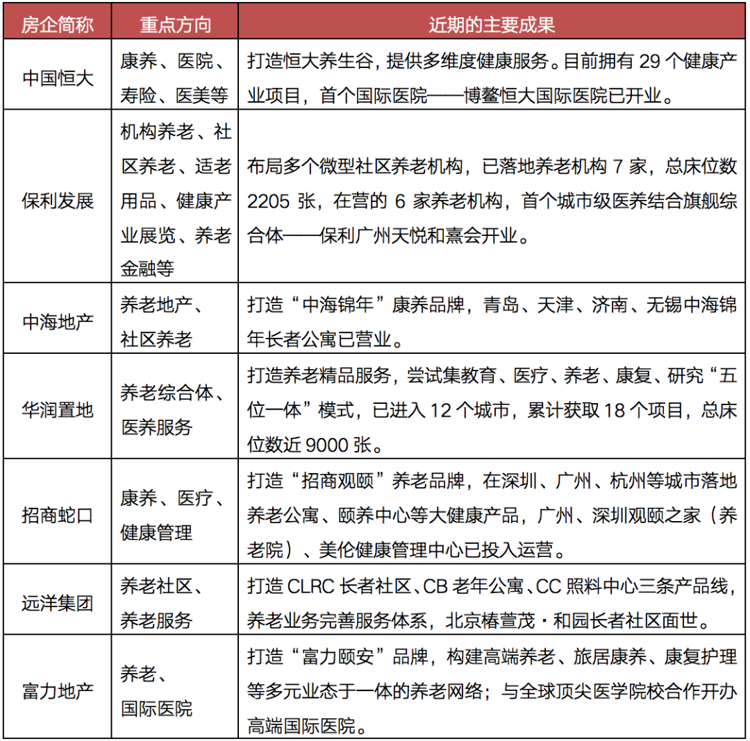 從資產結構看,輕重資產相結合是典型房企主要的投資模式,既持有重資產,也運營輕資產。在重資產方面,房企布局最多的是以地產開發為載體的康養地產、長者公寓、養老院、醫院等項目。在輕資產方面,房企從社區養老服務、康復護理這些可歸入物業增值服務類別的業務。
