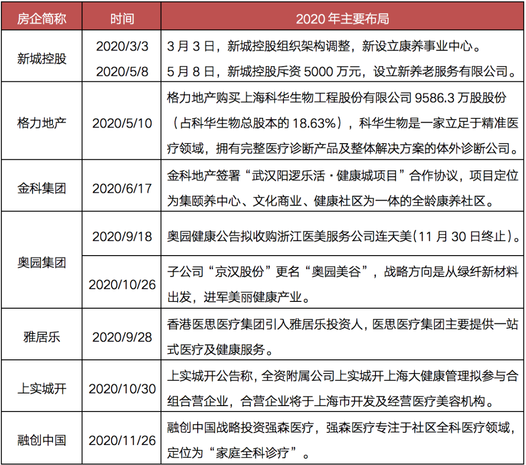 近期,房企在醫療健康領域的布局更是動作頻頻。11月下旬,融創完成強森醫療的戰略投資;10月,上實城開參與合營企業將于上海市開發及經營醫療美容機構;9月,雅居樂成為香港醫思醫療集團投資人、奧園健康公告擬收購浙江醫美服務公司連天美。