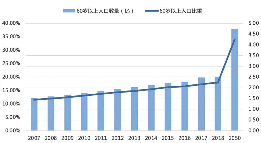 人口老齡化是社會必然的趨勢。2019年底,我國65歲以上老年人口已有1.76億,整體呈現出基數高、增長快的特征,養老需求供給面臨較大的缺口。從人口結構測算,自2022年開始我國每年新增老年人口將超1200萬,2022年-2050年,我國將會進入加速老齡化階段,我國養老產業將會進入黃金時期,養老需求爆發將會推動產業的飛速發展。