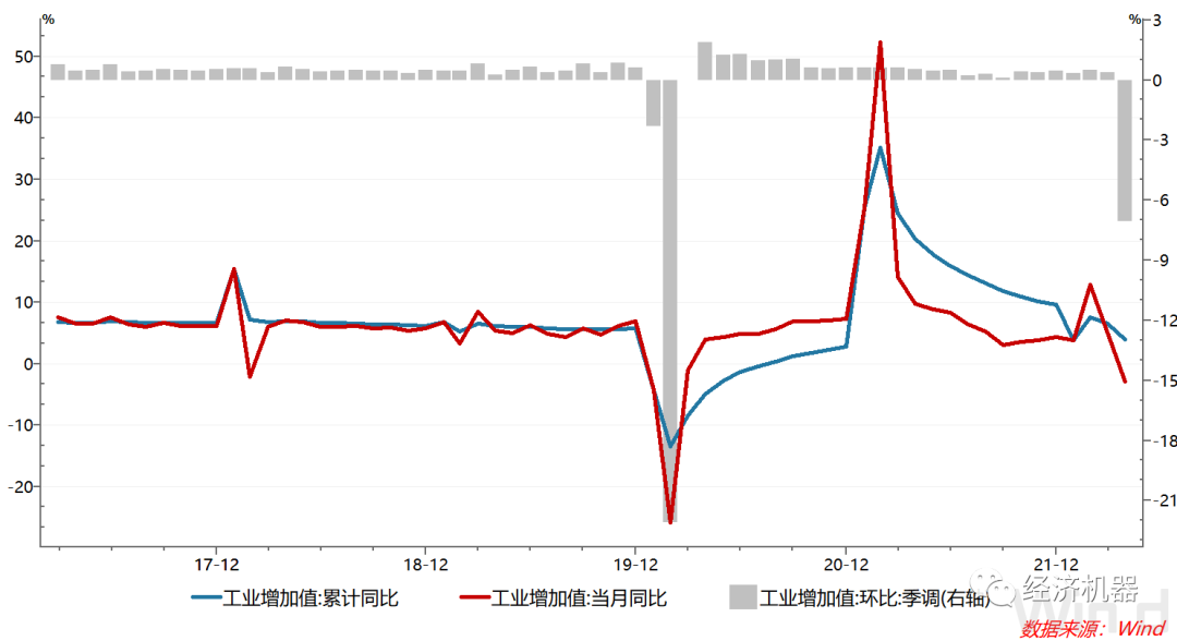 1)工業(yè)生產(chǎn)放緩,服務(wù)業(yè)下滑更為顯著。4月,工業(yè)增加值同比下滑2.9%,增速較上月回落7.9個百分點;環(huán)比下滑7.08%,增速較上月回落7.6個百分點,均為2020年3月以來首次出現(xiàn)負增長。