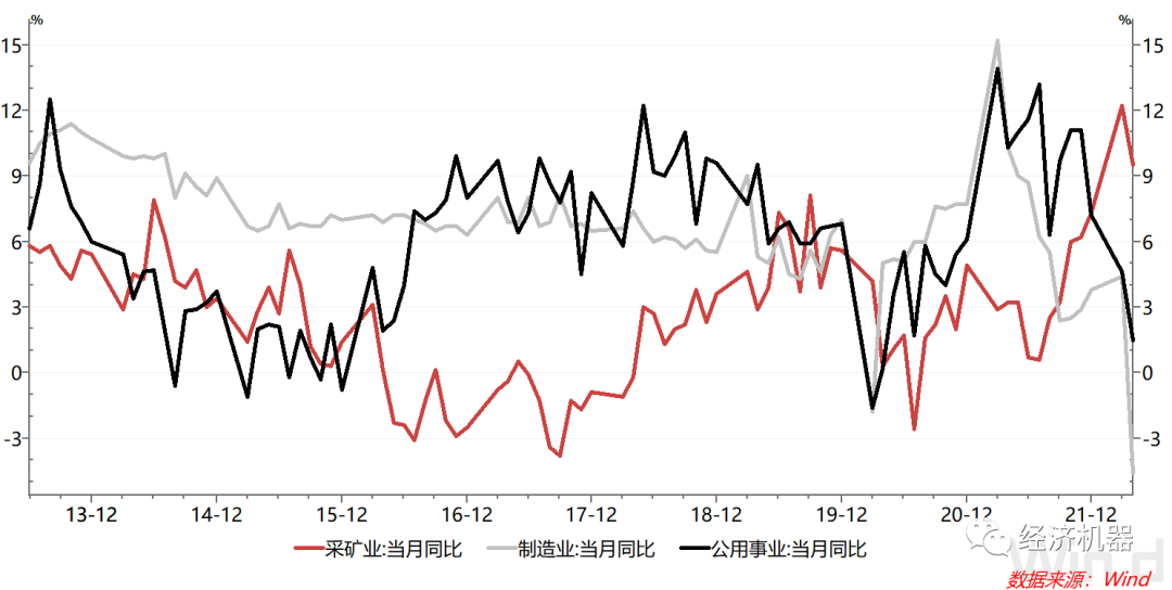 制造業(yè)工業(yè)增加值同比下滑4.6%,增速較上月回落9個百分點,也是近年來首次轉(zhuǎn)負。制造業(yè)對供應(yīng)鏈要求較高,疫情升級下,供應(yīng)鏈中斷對制造業(yè)沖擊尤為明顯。