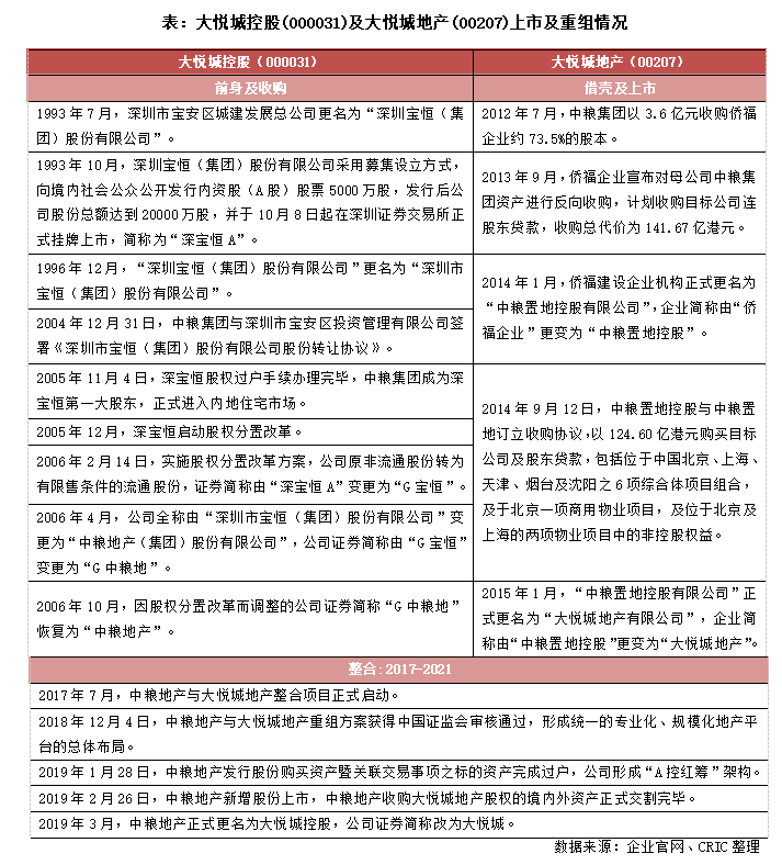 2011年,在國資整合大背景下,中糧集團將中糧置業(yè)、中糧地產(chǎn)、酒店事業(yè)部、海南公司進行整合,形成了“中糧置地”統(tǒng)一的地產(chǎn)業(yè)務平臺;此后2012年至2014年旗下投資物業(yè)通過僑福企業(yè)借殼上市,并將僑福企業(yè)更名為中糧置地控股,2015年再次更名為大悅城地產(chǎn)。