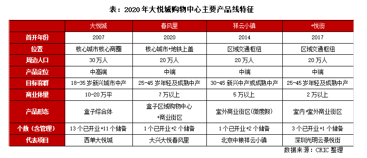 以年輕中產(chǎn)、成熟中產(chǎn)為核心客群、以“年輕、時尚、潮流、品位”為品牌定位,大悅城旗下零售商業(yè)的主客群為中高端消費者,目前推出大悅城、春風里和祥云小鎮(zhèn)三大核心系列,并以+悅街作為商住地塊中商業(yè)配套的補充。四大產(chǎn)品線在在客群和建筑形態(tài)相互承接,在定位、布局和產(chǎn)品標準等方面相互區(qū)隔。