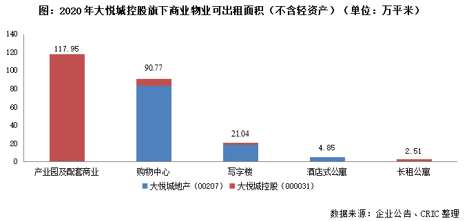 截止2020年底,大悅城控股(000031)旗下重資產(chǎn)在營購物中心項目12個,其中10個為大悅城項目,1個春風里項目,1個祥云小鎮(zhèn)項目,總可出租面積達90.77萬平米;輕資產(chǎn)在營購物中心3個,分別為天津和平大悅城、昆明大悅城及鞍山大悅城。除購物中心外,還擁有在營寫字樓項目5個,總可出租面積21.04萬平米;產(chǎn)業(yè)園及配套商業(yè)5個,總可出租面積117.95萬平米,為各業(yè)態(tài)中出租面積規(guī)模最大的。此外,還有酒店式公寓1個,出租面積達4.85萬平米;長租公寓5個,出租面積達2.51萬平米。從大悅城地產(chǎn)(00207)來看,其擁有除祥云小鎮(zhèn)外的11個購物中心項目,可出租面積83.26萬平米;5個寫字樓中的4個,可出租面積達18.5萬平米;以及1個酒店式公寓。