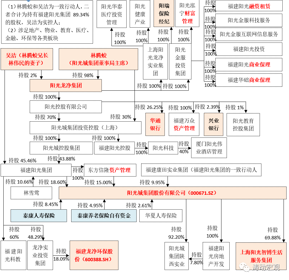 (2)進一步穿透來看,陽光龍凈集團通過陽光控股、陽光金服投資集團以及上海陽光龍凈實業(yè)集團對外進行產(chǎn)業(yè)布局,包括教育、醫(yī)療、金融等板塊。