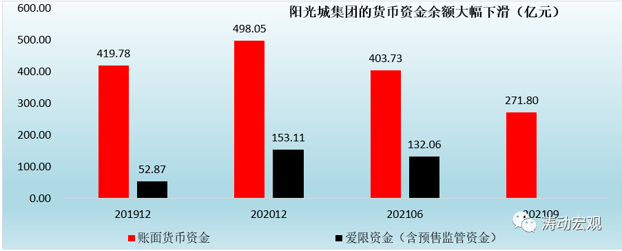 2020年底,陽光城賬面上的貨幣資金余額高達498.05億元,今年6月底與9月底分別進一步降至403.73億元和271.80億元,意味著今年上半年和三季度陽光城賬面的上貨幣資金余額分別凈減少94.32億元和131.93億元。與此同時,若按照受限貨幣資金的比例來看,今年9月底271.80億元的賬面貨幣資金可能有超過50%受限。