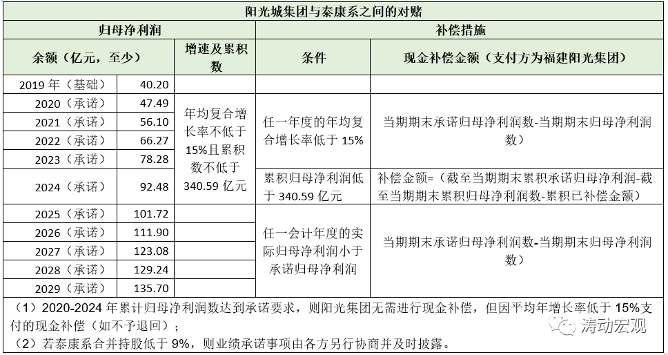 和派駐董事、現(xiàn)金分紅比率以及員工持股計劃等要求相比,最受關注的還是泰康系與福建陽光集團之間的十年業(yè)績對賭。