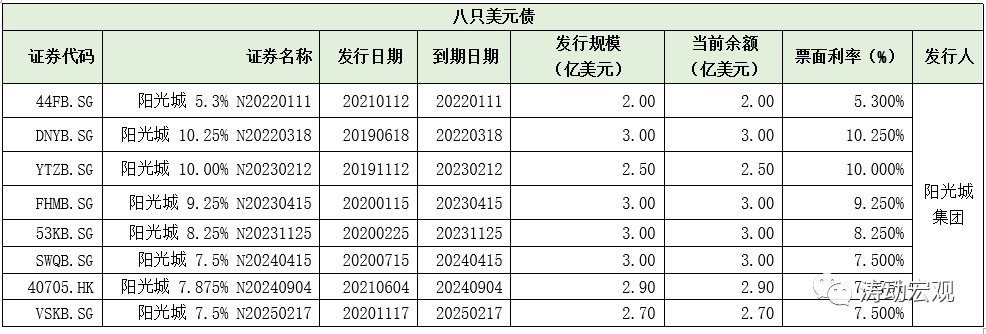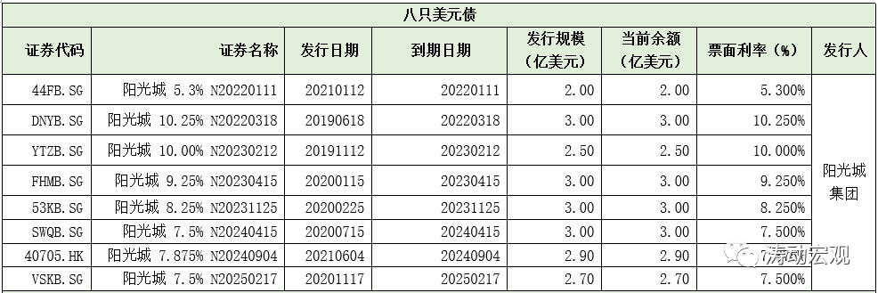 1、八只存量美元債(陽光城集團發(fā)行):余額合計22.10億美元