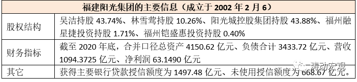 (1)陽光城體系的三大核心板塊分別為陽光城集團、福建陽光集團與陽光龍凈集團,主要從事著投資控股、地產(chǎn)開發(fā)、環(huán)保等業(yè)務,同時前兩大核心板塊也是陽光城體系的兩大發(fā)債主體。其中,截至2020年底,福建陽光集團的總資產(chǎn)規(guī)模達到4150.62億元、資產(chǎn)負債率達到82.73%,全年實現(xiàn)營收接近1100億元、凈利潤達到63.15億元,獲得主要銀行貸款授信額度接近1500億元。