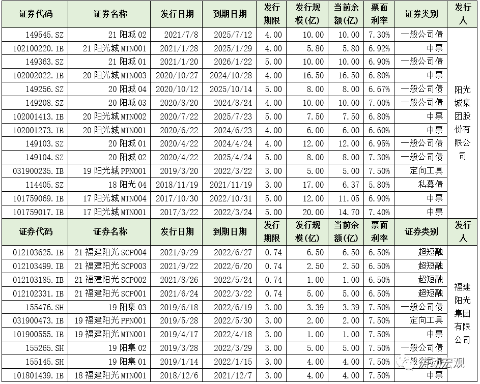 (1)除八只美元債和七只ABS外,陽光城體系目前還有24只存量境內債券,余額合計為165.31億元。其中,陽光城集團有14只存量債券(余額合計為130.92億元)、福建陽光集團有10只存量債券(余額合計為34.39億元)。