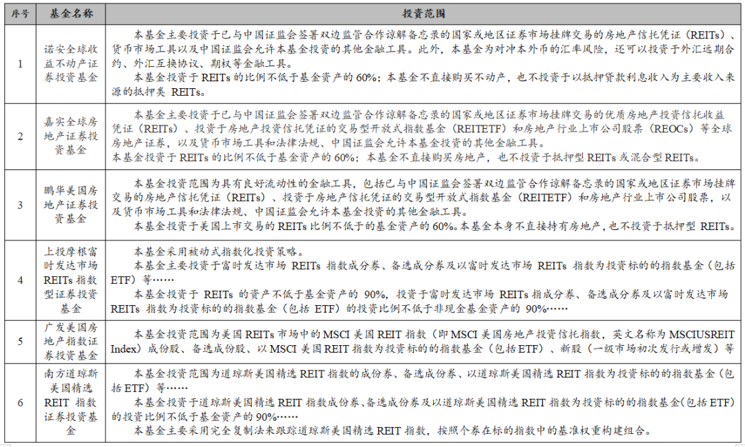 由于國(guó)內(nèi)目前并沒(méi)有真正意義上的REITs,投資者主要通過(guò)借道QDII基金投資的海外REITs。據(jù)小編查詢(xún),國(guó)內(nèi)市場(chǎng)投資REITs的公募基金共6只,均為QDII基金(其中3只為被動(dòng)式指數(shù)基金)。境外REITs和境內(nèi)基礎(chǔ)設(shè)施REITs本質(zhì)相同,通過(guò)QDII基金的資產(chǎn)配置策略可以了解REITs基礎(chǔ)資產(chǎn)的研判要點(diǎn),亦可以作為承做端的重要參考。