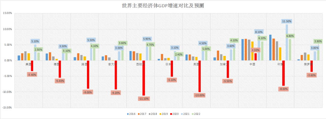 從中我們可以看出,大部分經(jīng)濟(jì)體的GDP增速都在2016或2017年達(dá)到了頂點,之后開始進(jìn)入常態(tài)化低增長階段。疫情從本質(zhì)上不會影響大勢,但會導(dǎo)致各經(jīng)濟(jì)體在2021年迎來一個增長高峰,之后增速會繼續(xù)緩慢下滑。