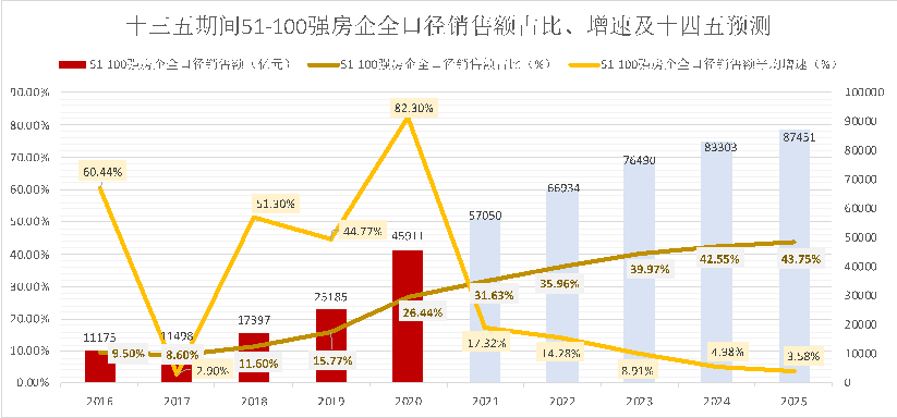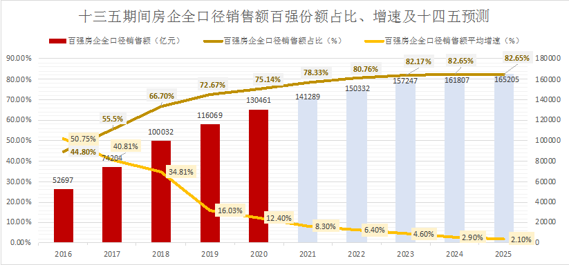 參照十三五期間百強房企銷售額占比,十四五期間百強房企銷售額市場份額仍將繼續(xù)上升,預(yù)計還有約10%的增長空間;
