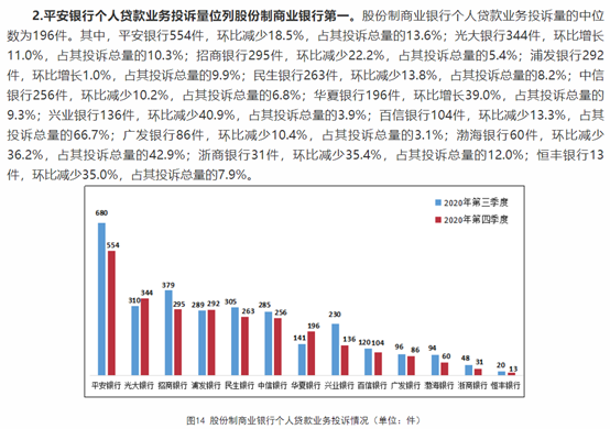 根據中國銀保監會消費者權益保護局關于銀行業消費投訴情況的通報,平安銀行的理財類業務投訴量在2020年第二季至第四季度均居股份制商業銀行首位,數量分別是470件、680件和554件。