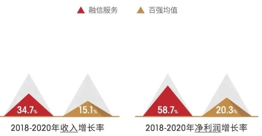融信服務2018年-2020年收入復合增長率34.7%、凈利潤復合增長率58.7%,均高于百強物企的增長率平均值。