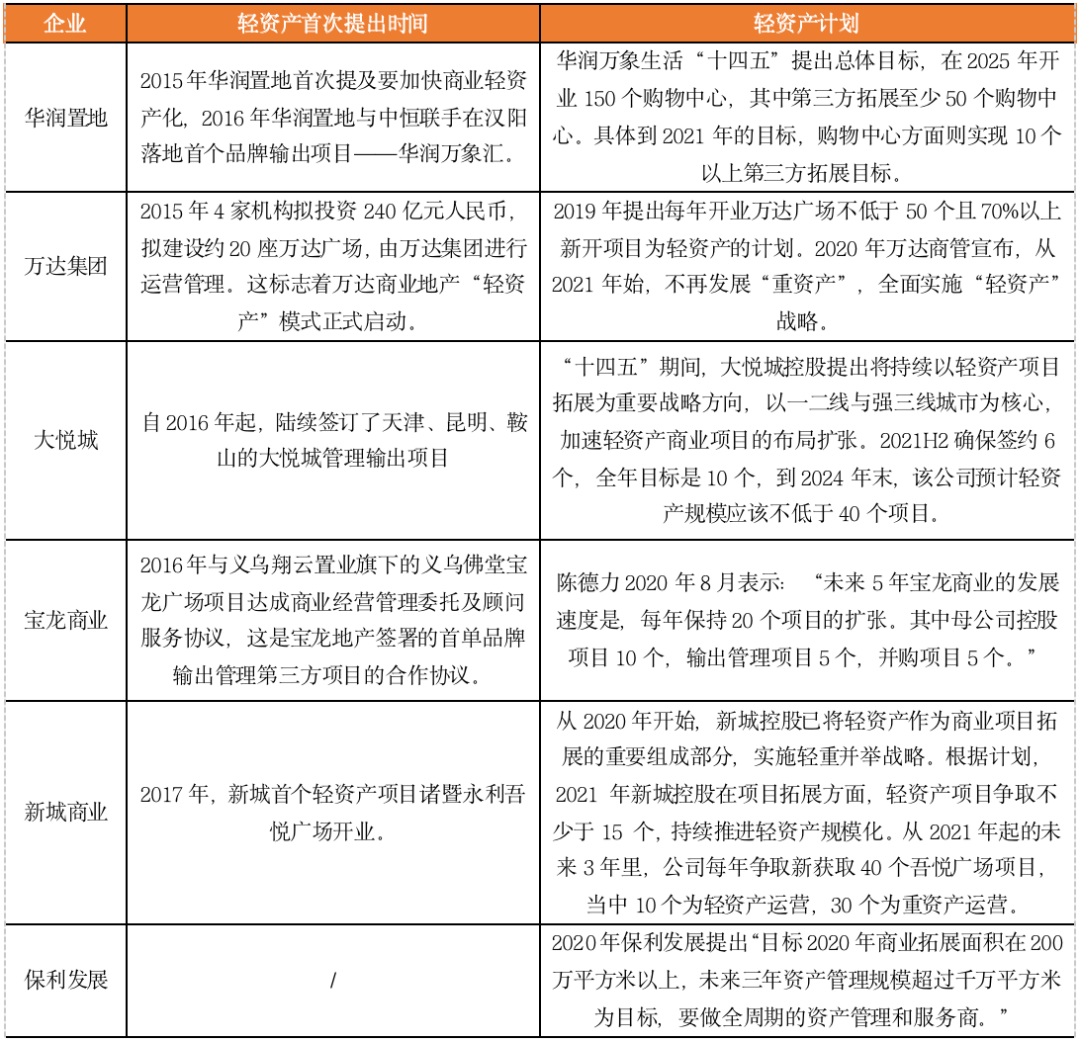 輕資產(chǎn)已經(jīng)成為商業(yè)地產(chǎn)運(yùn)營(yíng)的重要趨勢(shì),當(dāng)前國(guó)內(nèi)大部分頭部商業(yè)運(yùn)營(yíng)房企基本涉足輕資產(chǎn)品牌管理輸出。