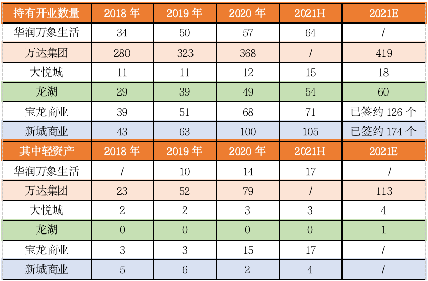 不過(guò),當(dāng)前部分房企仍以重資產(chǎn)戰(zhàn)略、合作為主,輕資產(chǎn)品牌輸出仍只是作為輔助手段進(jìn)行運(yùn)營(yíng)。比如,龍湖當(dāng)前已經(jīng)開(kāi)業(yè)60家天街項(xiàng)目,僅有一家是輕資產(chǎn)管理輸出,新城控股2021年中期開(kāi)業(yè)項(xiàng)目達(dá)到105個(gè),僅有4個(gè)項(xiàng)目是通過(guò)管理輸出實(shí)現(xiàn)。