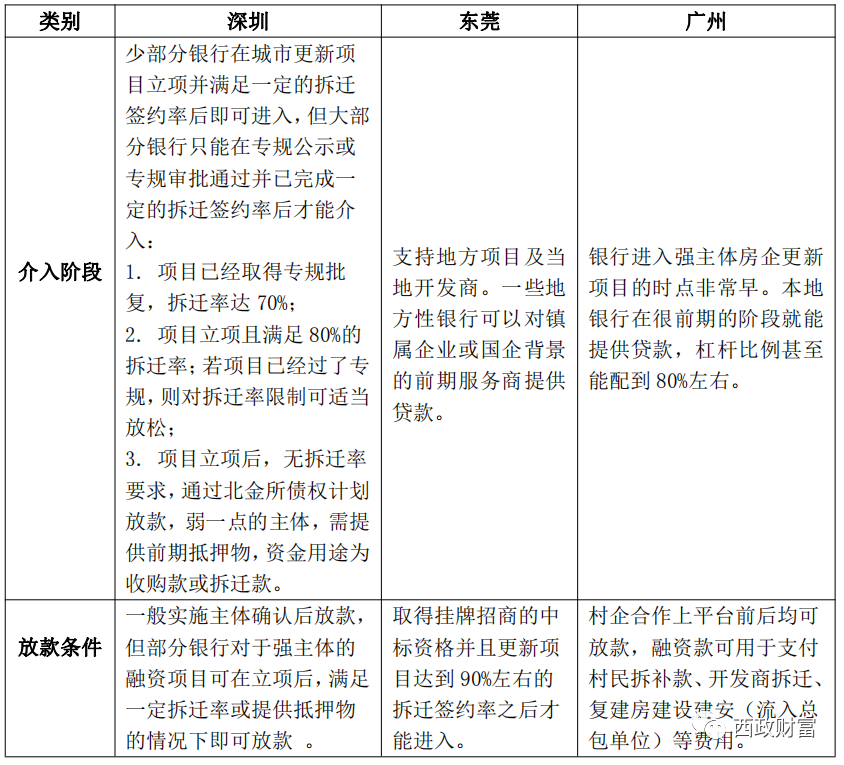 在大灣區范圍內展業的銀行的相關城市更新貸、拆遷貸產品相對成熟,而大灣區之外的銀行目前亦在加強政策研究,跟進政策風向,試圖打開城市更新融資的切入點。以下就大灣區范圍內銀行介入城市更新相關要求進行舉例。